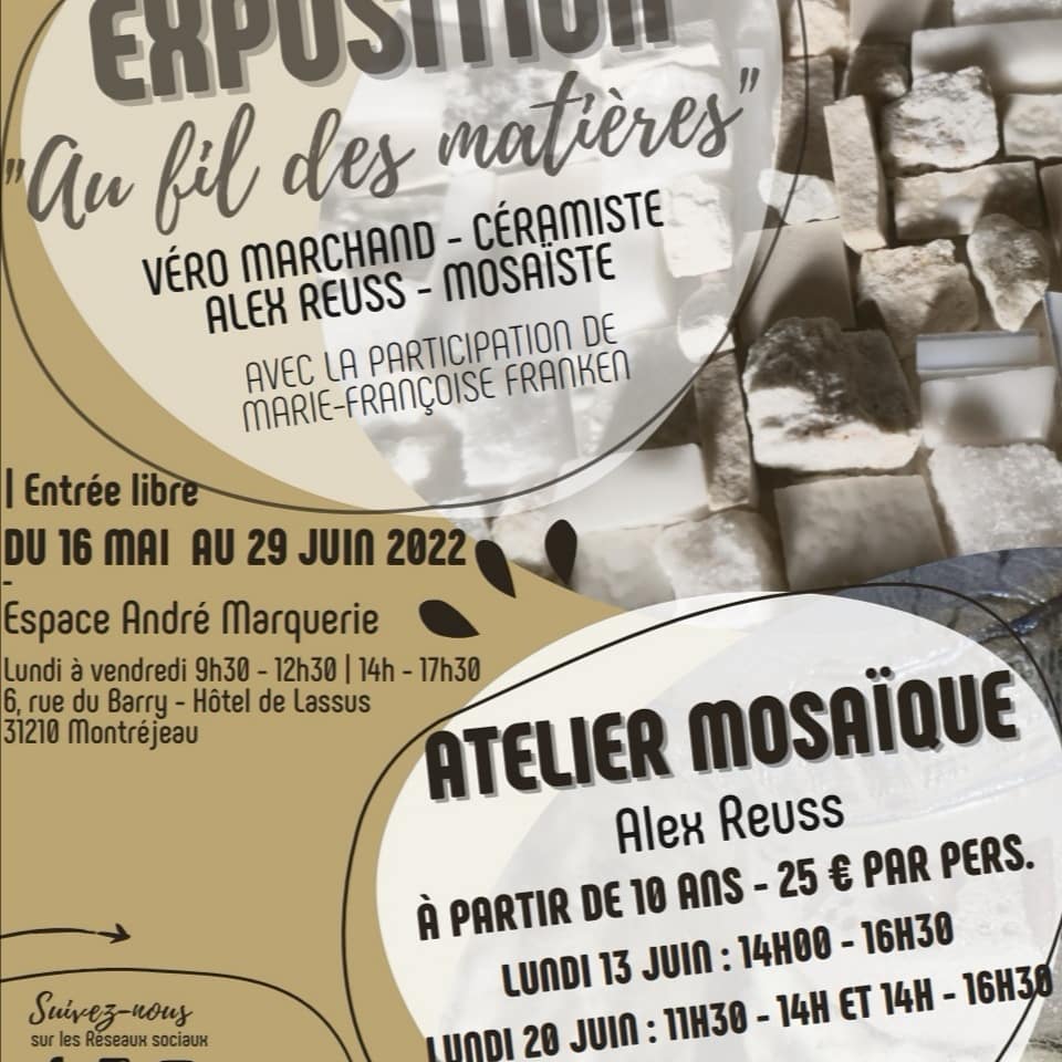 EXPOSITION OT MONTREJEAU 16 MAI – 29 JUIN 2022 Publié le 9 mars 202216 Mai 2022 par atelier ALEX REUSS Exposition avec la Céramiste Véro Marchand avec la participation de la fileuse Marie-Françoise Franzen. Atelier mosaique en juin ! Hôtel de Lassus /6 rue Barry – 31210 Montréjeau Similaire