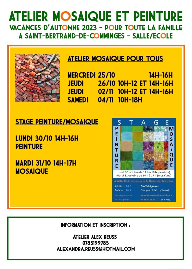 ATELIERS VACANCES D’AUTOMNE (31) Publié le 19 octobre 202319 octobre 2023 par atelier ALEX REUSS A LA SALLE d’école de Saint-Bertrand-de-Comminges Similaire