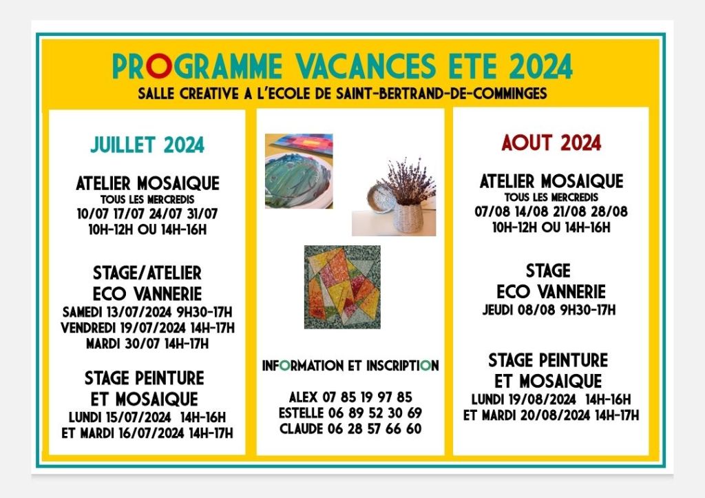 ATELIERS CRÉATIFS /VACANCES D’ETE À SAINT-BERTRAND-DE-COMMINGES (31) Publié le 19 Mai 2024 par atelier ALEX REUSS Similaire