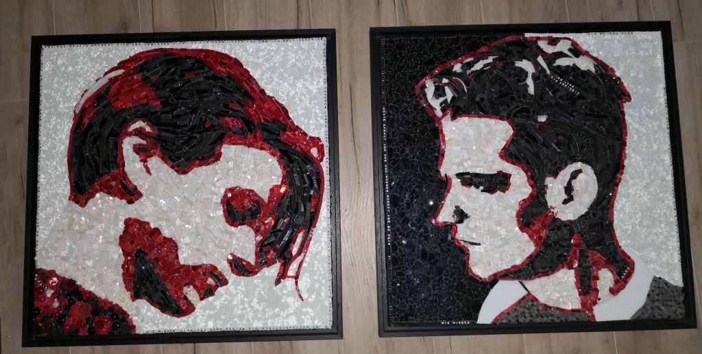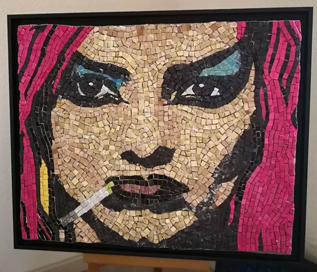 PORTRAITS Les yeux de Romy Schneider. Mosaïque en verre commencée dans un stage en 2023 chez Marita Schauerte Bischofswiesen/Allemagne. www.mosaik.studio.de